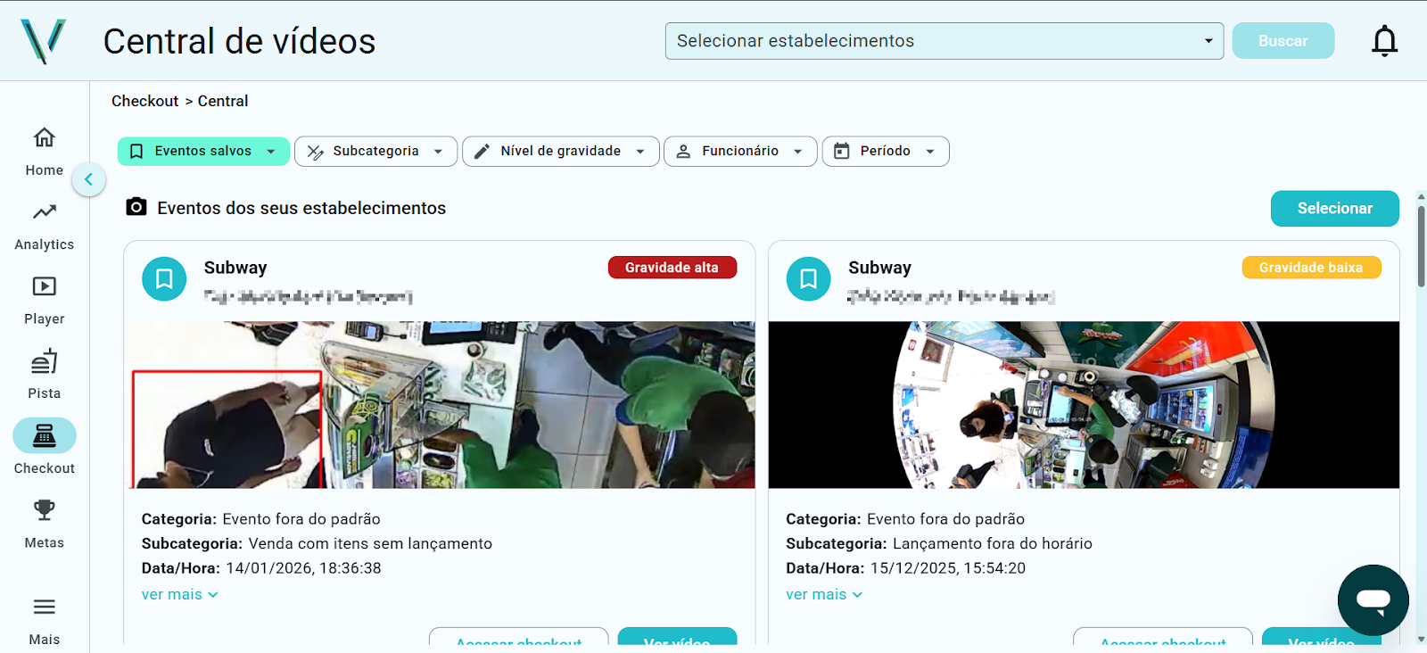 Video Center filters open, showing options for user, category, severity, and time period.